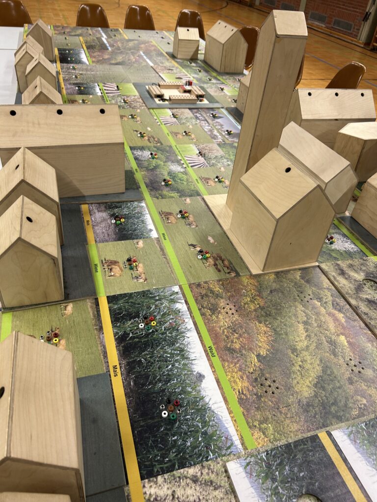 Spielerisch wurde so für die beteiligten Schulklassen und uns erlebbar: Allein durch Verhaltensänderungen kann schon jede Menge Energie eingespart werden. Die für die Ernährung notwendigen Flächen können durch eine Reduktion des Fleischkonsums besser genutzt werden, so dass auch noch Platz für Wälder und Artenschutz verbleibt. Im Rollenspiel eines Gemeinderats geht es dann darum, wie gemeinsame Entscheidungen demokratisch ausgehandelt werden.