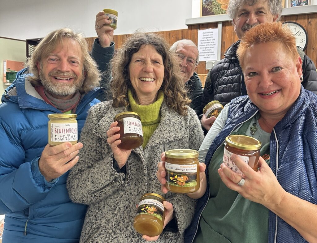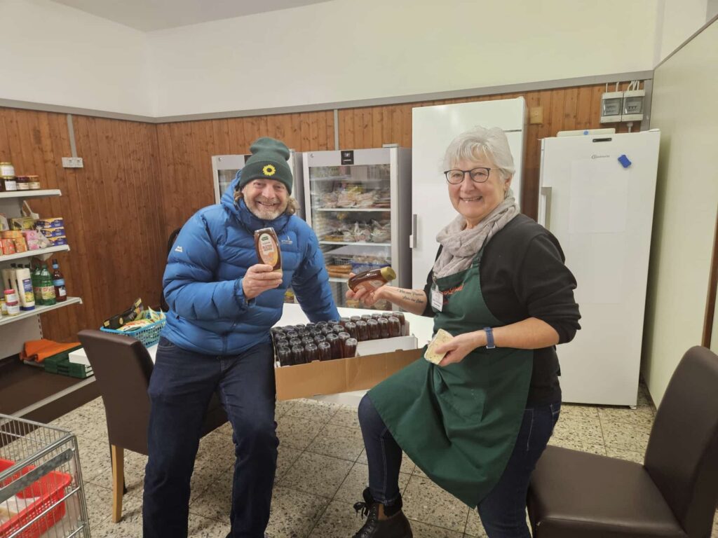 Die Antwort von Sabine Fiedler war: „Honig ist ein teures Lebensmittel, das sich viele unserer Gäste sonst nicht leisten können. Deshalb freuen wir uns, wenn wir viele Gläser verteilen können. Gleichzeitig gibt es Menschen, die hochwertigen Honig auch zu schätzen wissen.“ Die mitgebrachten Gläser werden also gezielt an Interessierte ausgegeben. Danach hat Bürgermeisterkandidat Dieter Pletz eine größere Menge einfacher praktischer Packungen wunschgemäß noch zusätzlich gespendet.