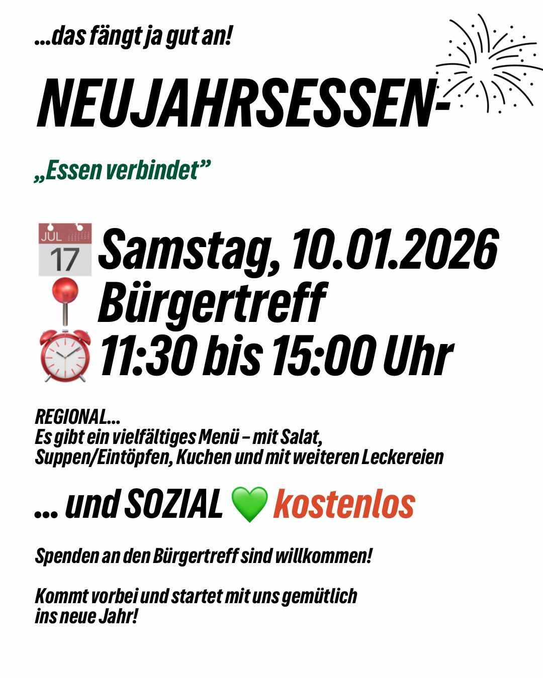 Neujahrsessen Samstag10.01.202611:30 – 15:00 UhrBürgertreffObere Wehd 290518 AltdorfDownload als ics-Datei